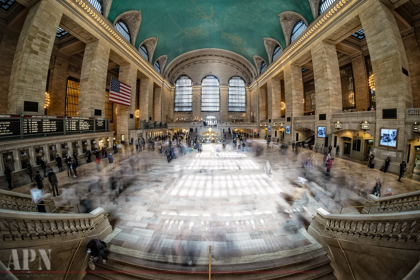 Mid-morning on a Tuesday. The Main Concourse of NYC's Grand Central Terminal is bustling with commuters, tourists and assorted people in transit. The natural sunlight coming from the huge windows located on either end of the concourse is balanced with the warm artificial light emanating from the huge chandeliers that decorate the side walls. This is a cavernous space, 84 m long, 37m wide and 38m high, and always filled with crowds of busy people.